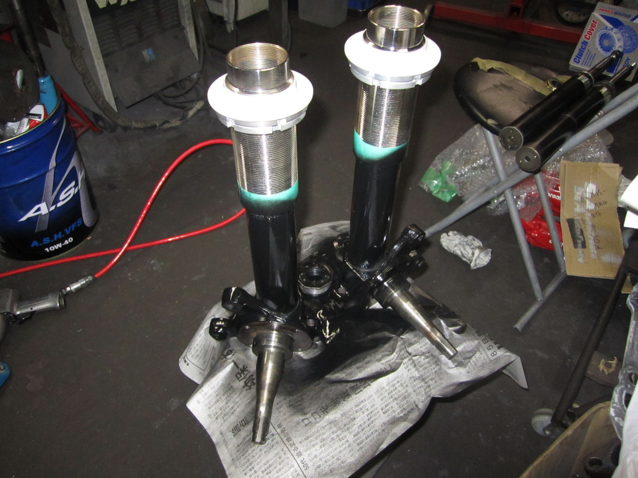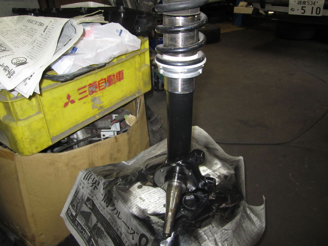 510のフロントストラットです。横に出ているシャフト部分周辺をスピンドルでこのタイプをスピンドル一体ストラット呼びます。車高調整タイプに加工中の写真です。