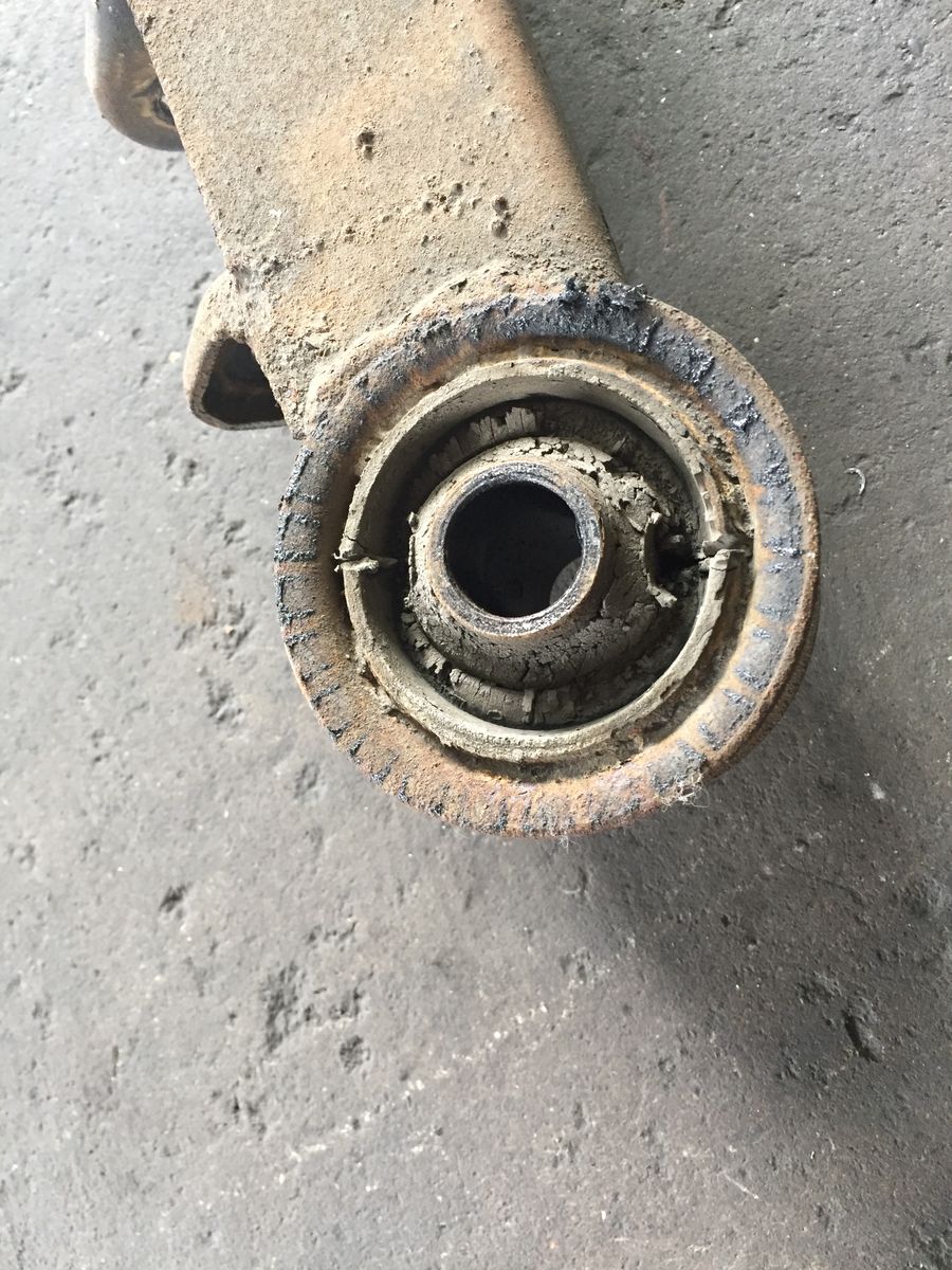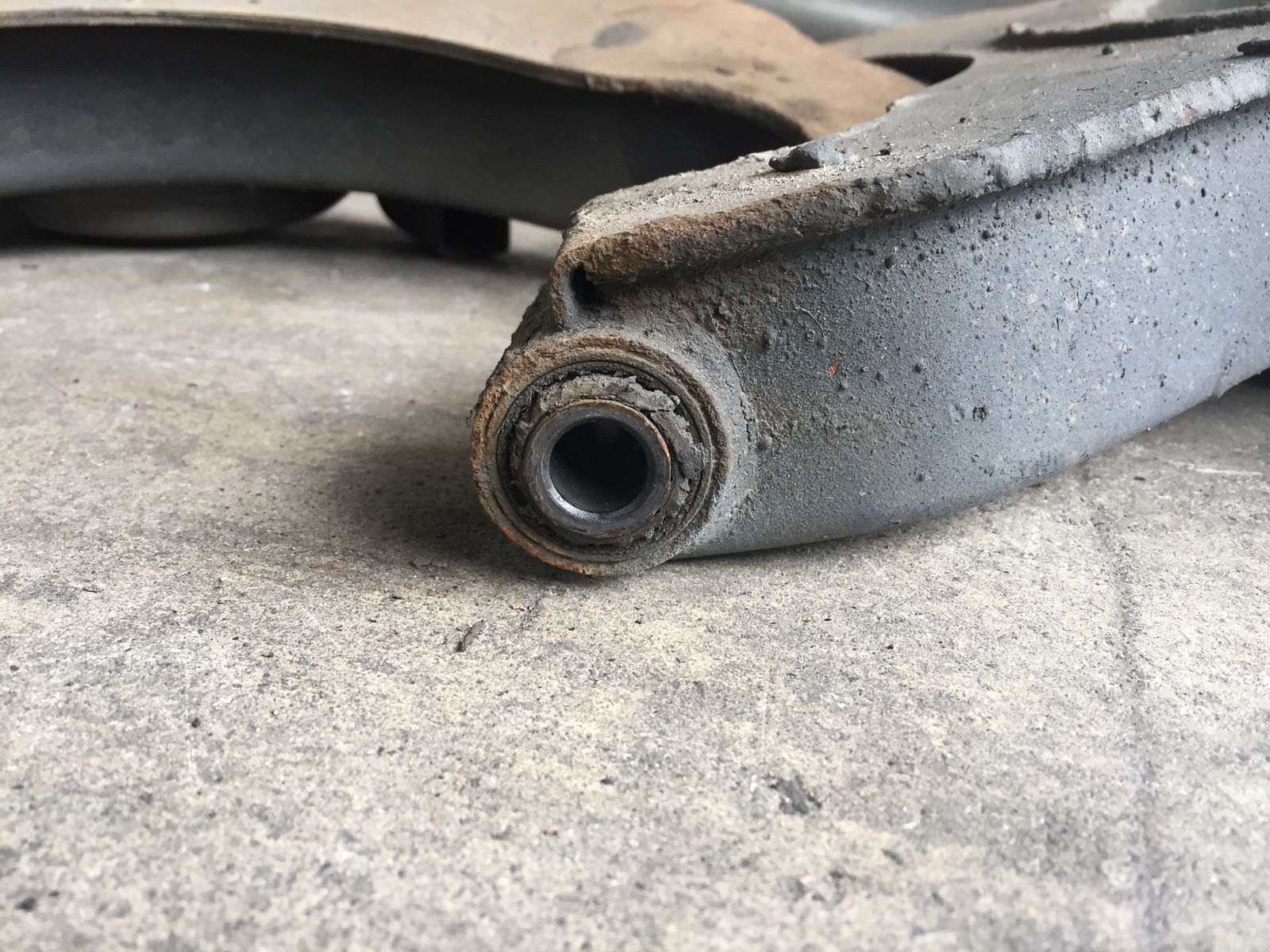 ロアアームも同じ状態です。可動範囲も大きくなり異音なども発生するようになり、点検してみるとリヤーサスペンション自体が人間の力でも全体的に動いてしまう状態です、さすがに入力を規制できず作動時のアライメントはあっちこっちでは落ち着きがありません。ここまで使えばブッシュも本望だと思います、ブッシュを交換すると良いとも言いますがここまでの物ではないのであればやみくもに交換もどうかと思います、さらにゴム硬度の高い物に変更はさらに動きの規制が進みリバンプの荷重がないスプリングの使い方では路面への追従性が乏しくなると思います、ゴム硬度が必要な場合はGが大きい速度域だと必要で低速の速度域では規制が大きいので逆効果だと考えます。ブッシュが固いからゴツゴツするでなく、規制されて追従ができないと解釈した方が素直な考えになります。ブッシュを交換するならばサスペンションの核になる部分はキッチリと固定しアーム類は緩めのゴムでアームストロークを確保し作動時のアライメント変化が少ない事がベストです。サスペンション形状が古いからダメとかでなくそのサスペンションの動きを見極めて何が悪いを判断できれば良い状態で使うことができます。