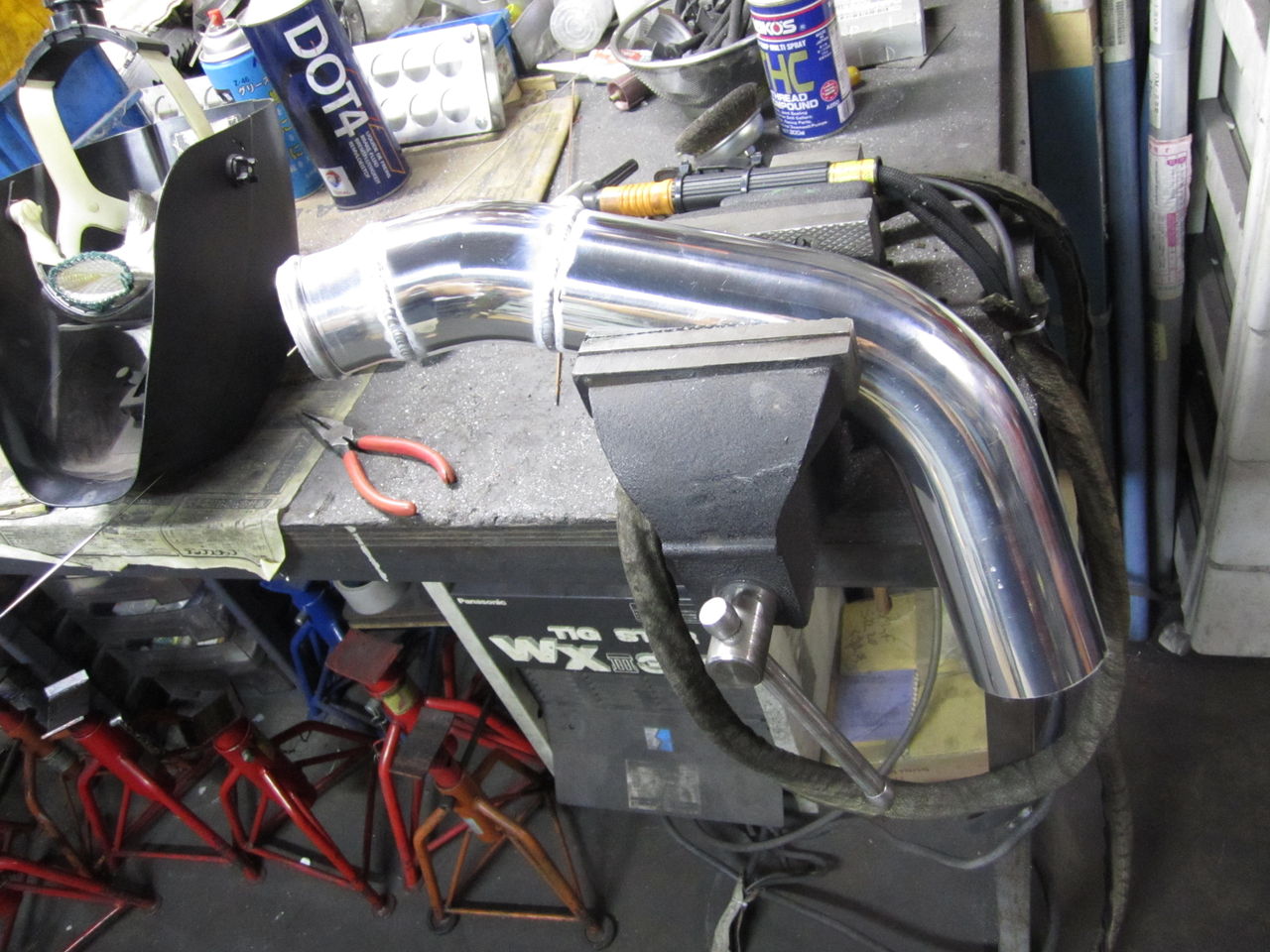 インタークーラーoutが60Φなので60Φパイプをテーパーに加工し70Φに変更します。インタークーラー側を変更でも良いのですが、製品が良いので今回はいじりません。テーパーからすぐに30°ベントに接続しフレームを逃がします。