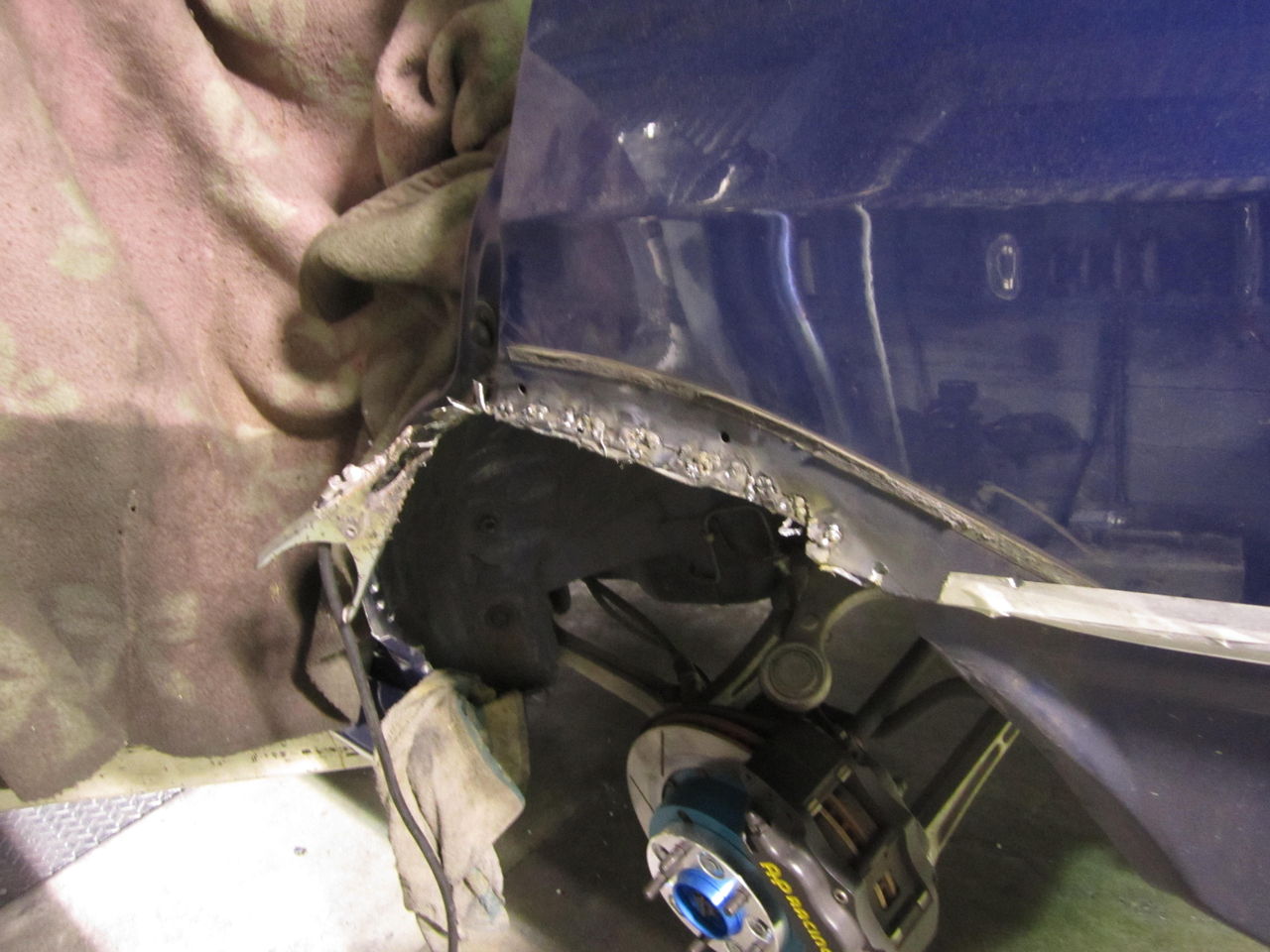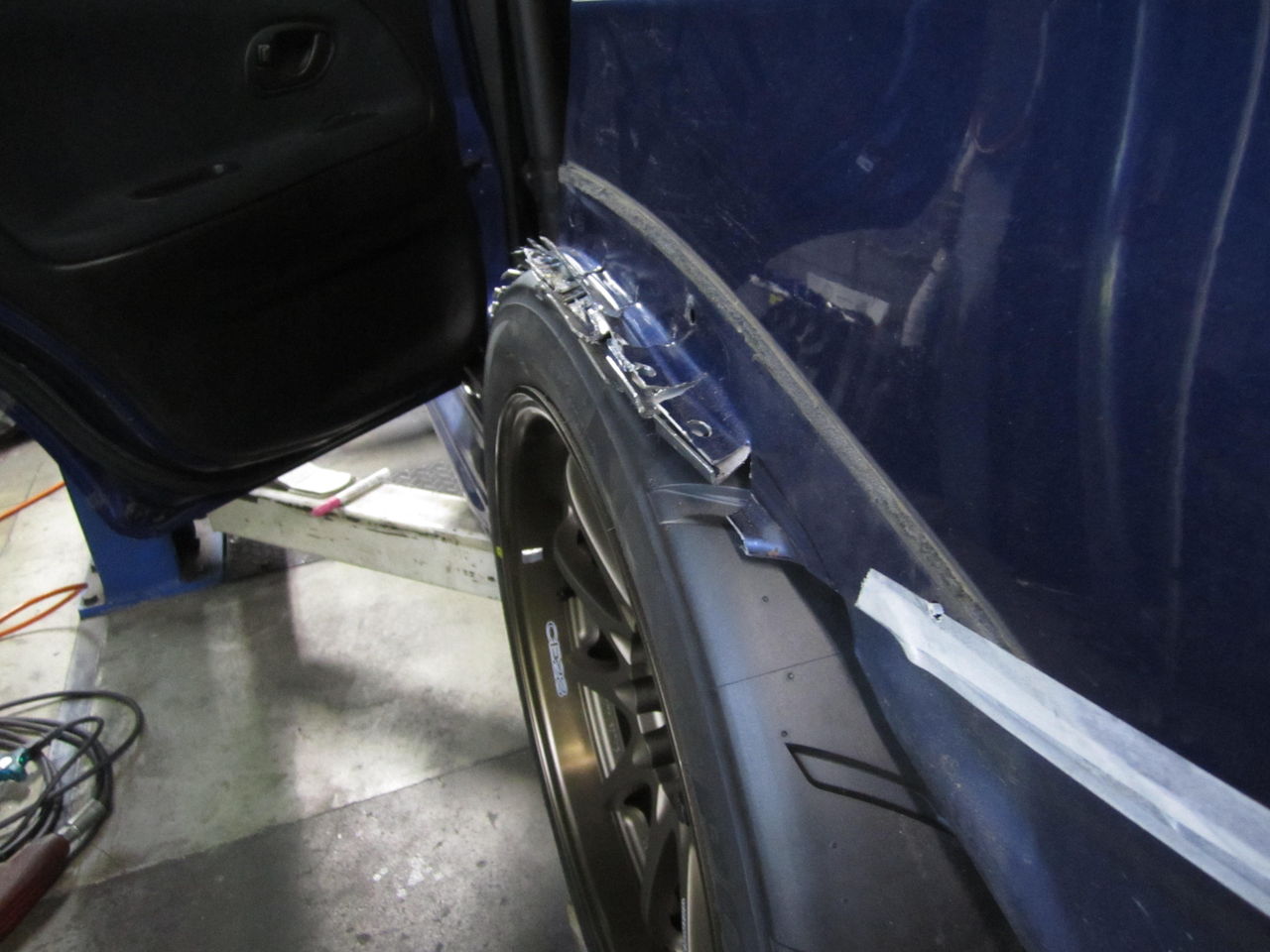4ドアで車高を下げると必ず当たるドアの折り返し、EVO6はこれでリヤが下がらず、足のセットが出しにくかったりします。当たる部分をとりあえずカットと折り曲げで様子をみます。
