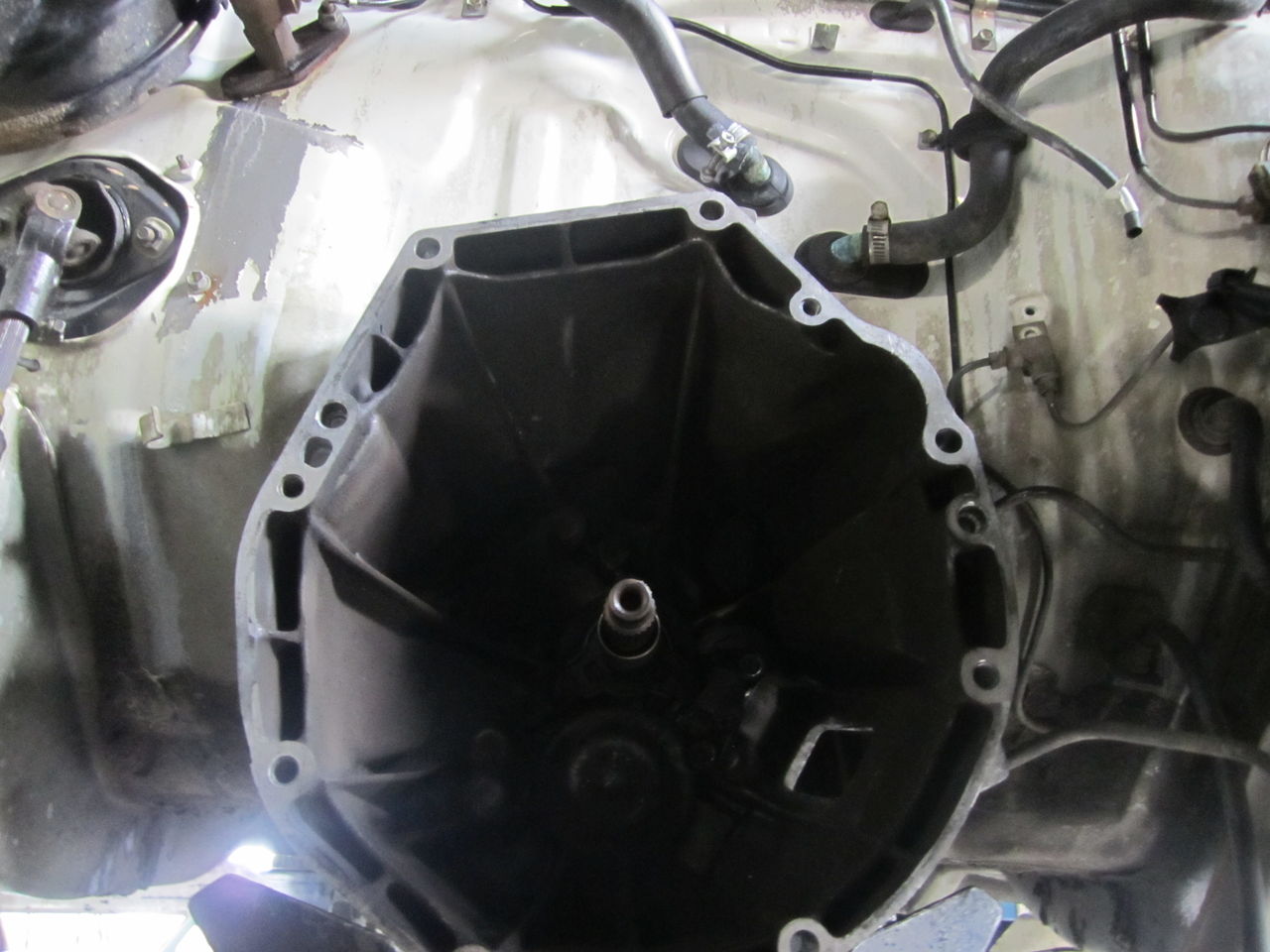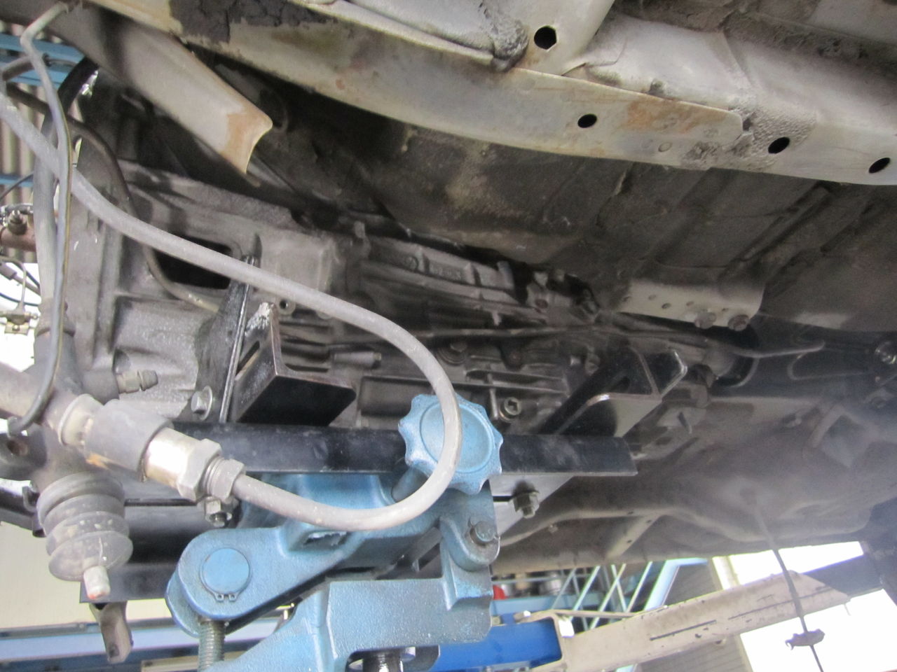 フロアートンネルが小さいのでミッション単体で仮組み。接触部分を加工します。