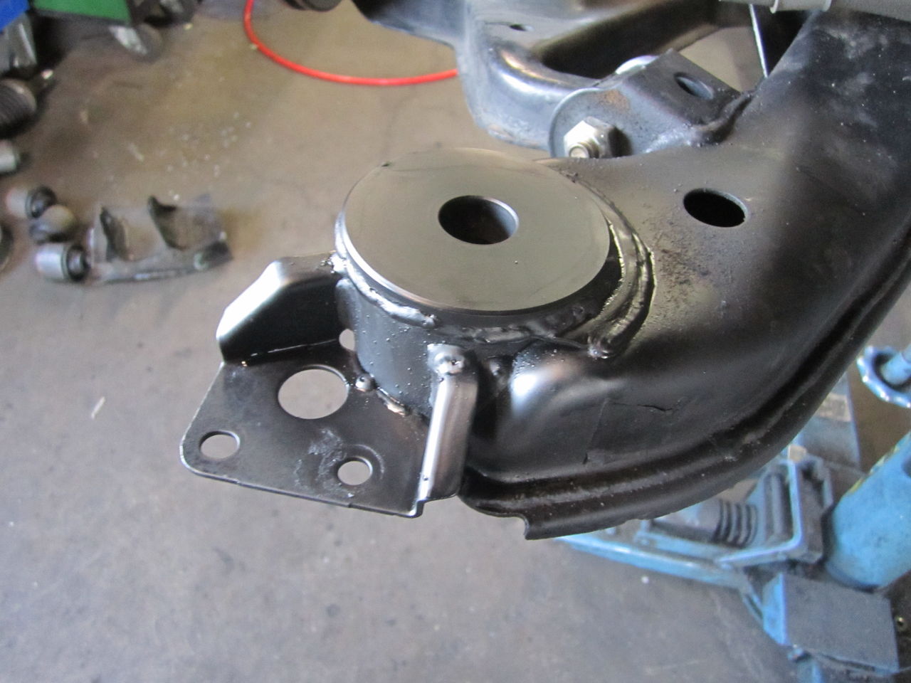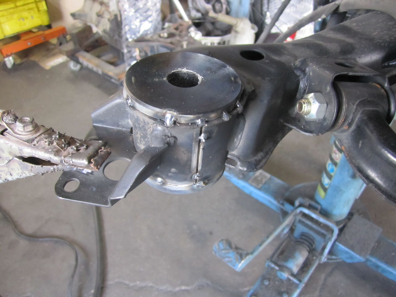 ブッシュ圧入部の上下に溶接カラーをはさみ溶接します。アルミの削りで圧入タイプもありますが、ハイトの変更ができない、スチール部分にアルミを圧入され、サスアームの入力をここが受け止めるのに異種金属の圧入だけではアルミが負けるので結果ガタが出たりで意味ない物に、コチラも作業を頑張れば誰でも出来る的な部品だったり、なので溶接タイプを使用し作業的な難易度が上がったとしても性能重視にしていきます。
