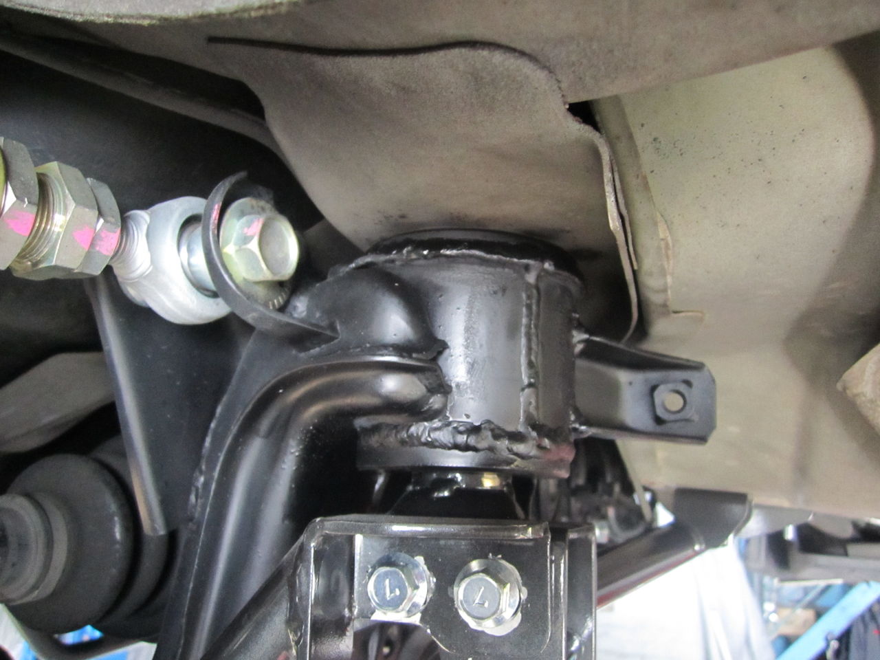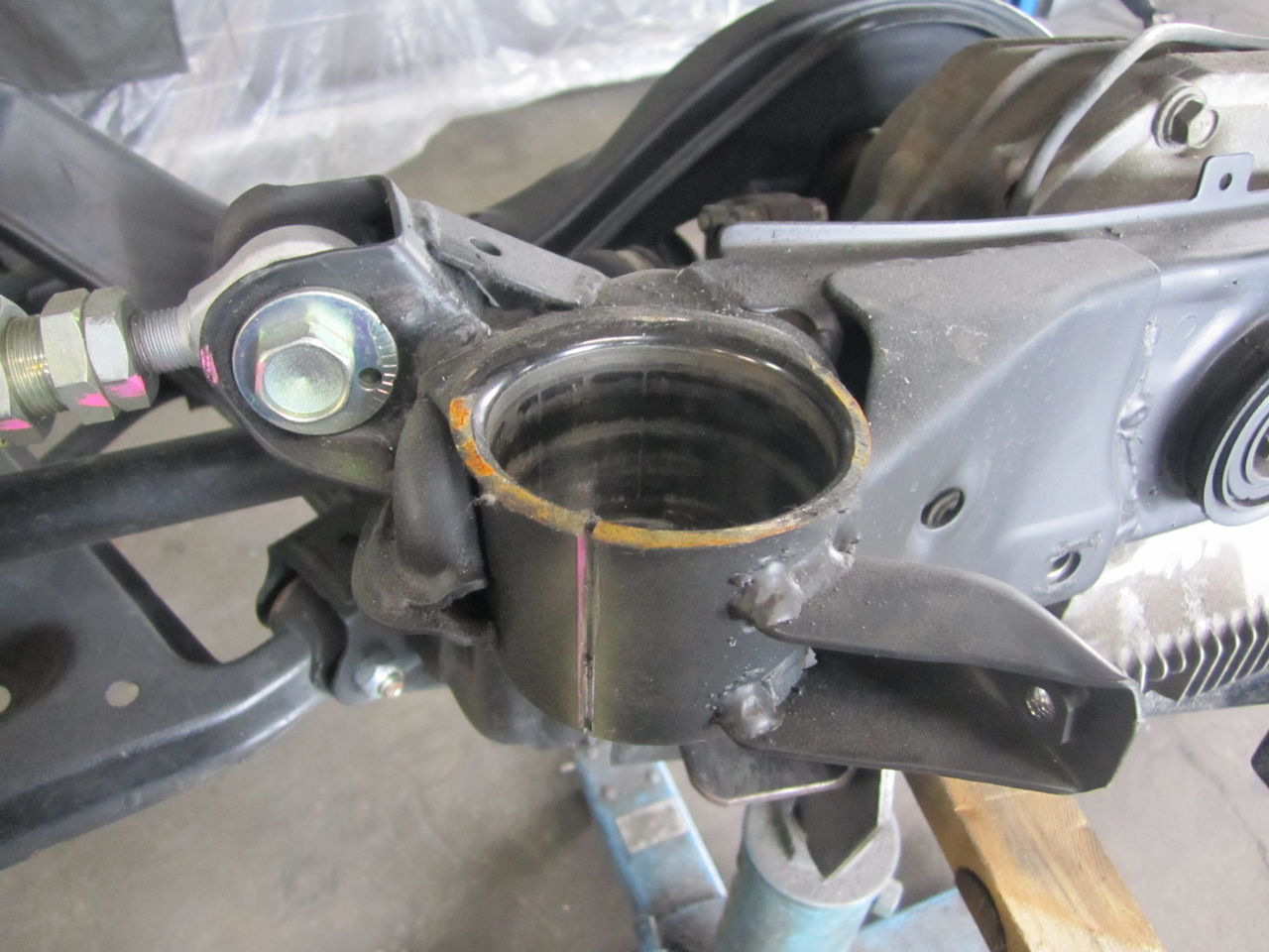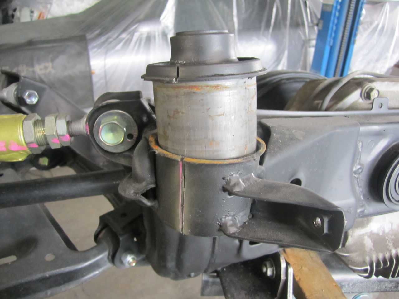 サスメンバーを降ろした状態のメンバーブッシュ部分です、リジットカラーが現時点では使われていますが、リジットカラーはブッシュが多分、動かないかもね位の物と考えます、ここが動けばメンバー自体がストロークしたり、サス剛性が向上するとも思えないので好みません、作業的に簡単なので雰囲気が欲しい場合はありですが