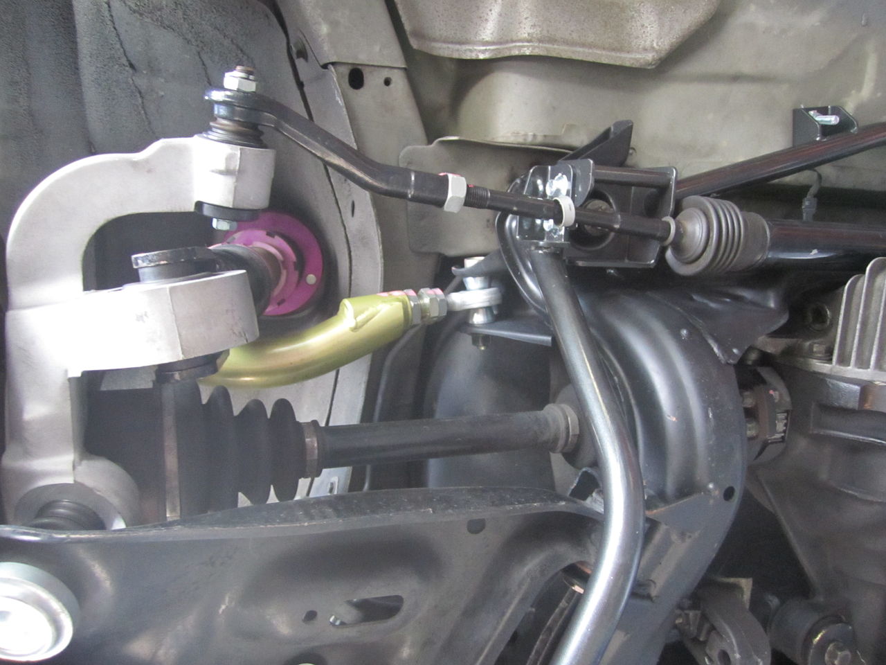 メンバーを装着状態です、当初の状態よりもメンバー自体が上方に上がります、なぜメンバーを上げるか分からずに、はやりとか噂だけでメンバーを上げている訳ではありません。ボディーの加工が出来ない車両なので出来る事を制約の中で目一杯やるためです、ですから低さ+性能向上はここから始まると思っています。この位で終わってたらS&Aじゃないですよね?