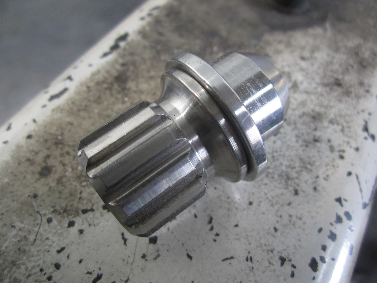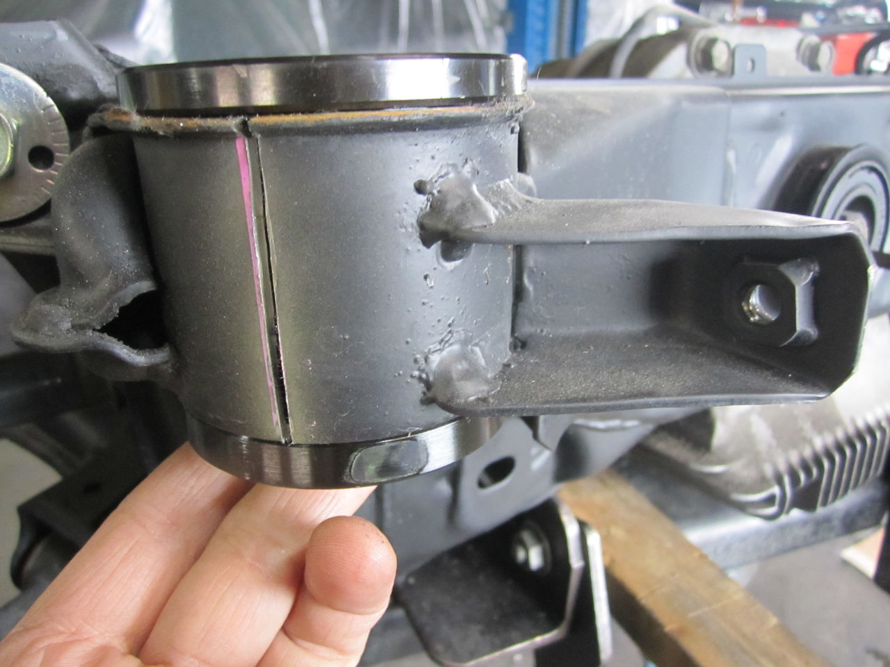 ブッシュ圧入外側に割を入れてしまいます。まじめに抜いていたら大変なので、割いれて簡単に抜き、カラー溶接時に割も溶接