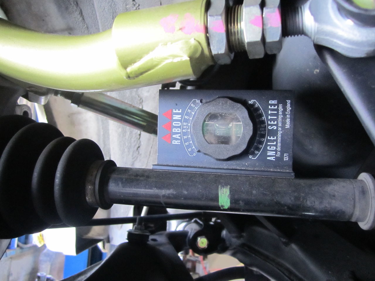 何パターンの角度でプリロードを測定、右の写真が約5°左の写真が約10°、角度が上がるにつれてプリロードも比例に近い状態でプリロードが増えていきます。ドライブシャフトのベアリングがやはり抵抗になるようです、一定のプリロードではなくカクンカクンといった様な回転になります、写真からでもそんな上がった状態ではないですが、測定する事でこの位でも抵抗が増えるのが分かります、よく1G状態でバンザイなどと言いますがドライブシャフトがそんな状態ならば、かなりの抵抗になると考えましょう。それが低出力の車ならば顕著に現れると確信します、バンザイ関係ないよ、なんて、絶対にジオメトリーの観点やドラシャの観点で言えないと思います。