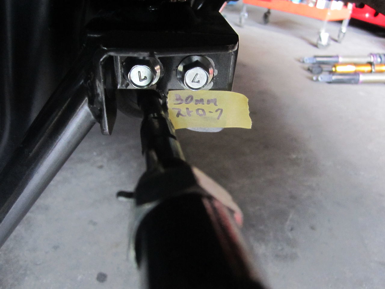 バンプストロークさせてみます、とりあえずアームロックのストロークを確認します。トーロッドが始めにロックしました、約50mmでロックです。50mmはありと言えばありですが、アームロックはもっと上でさせたいのでトーロッドは要加工になります。