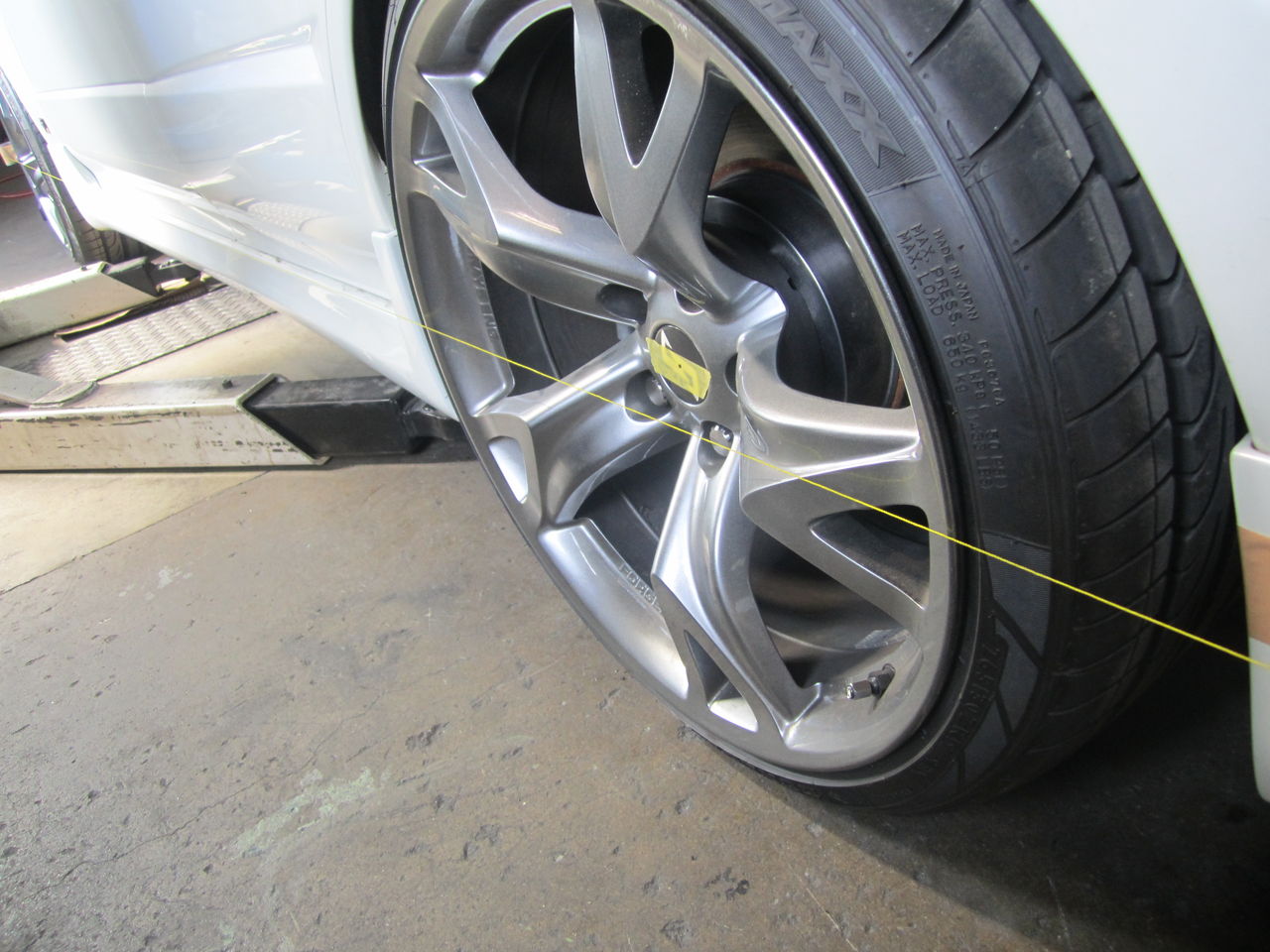 これでアライメントと考えますが、ここでアライメントはただのアライメントになってしまいます。今回は狙ったサスペンション作りなので簡単には終わりません。1Gでタイヤの向きをそろえても、ただのサスペンション性能が低下した車に無駄な努力をするだけです。本当に狙うべき所が分からないからここらで終わる事が多いと思います。車高下げてのアライメントはアリだけどナシです。