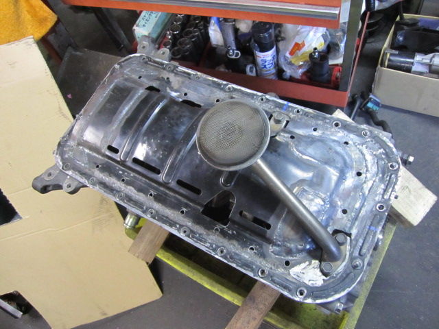 さらに油の入ったオイルパンにバッフルを載せ確認です。動きの少なくなったオイルもバッフルに遮られるのでクランク側には上がりません。左に傾き搭載されるFJ20ですがこの作りなら右廻りの高速サーキットでも 有利に働きコーナー中のオイルによる力のロスは無くなります。本当はオイルストレーナーを撤去しオイルポンプから外部にパイプを回しオイルパンの外からオイルを吸わせてバッフルをもっと密閉にしてやりウェットだけどドライサンプ風味を強くしたかったのですが、やりすぎ禁物なので、なんとなくドライサンプ風味で完成させました。これでFJはなんて言わせませんよ!!!FJはまだまだしつこい位に続きます。