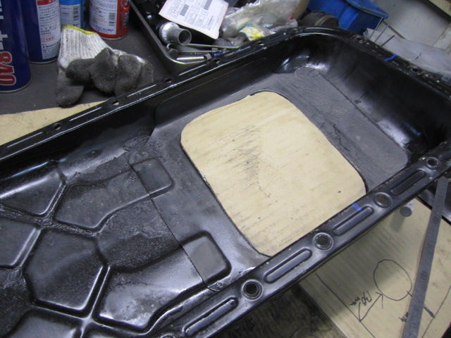 オイルパンも当然加工します。型紙がある部分が開口部になり、オイルストレーナーのサイズから考えると不必要に大きいので最小限の開口部にしていきます。とりあえずの型紙で塞ぎ、どの位置にストレーナーが来るか計算し最小限の穴を開けていきます。