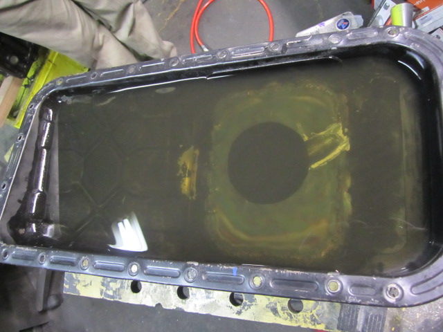 完成後、とりあえず4Lの洗油を入れてみます。この状態でオイルパンを軽く動かすとパーテ―ションの上と下で油の動きがまるで違うのを確認します。丸の中は当然動きが少なく、パーテ―ション上は良く動きます。動く量がこれで格段に減るのでクランクに当たる事も少なくなる事が分かります。また、パーテションの下の部分は動きが少ないのでGでプレッシャーの低下も起きない作りになりここで温度の多層化が生まれる仕組みになります。