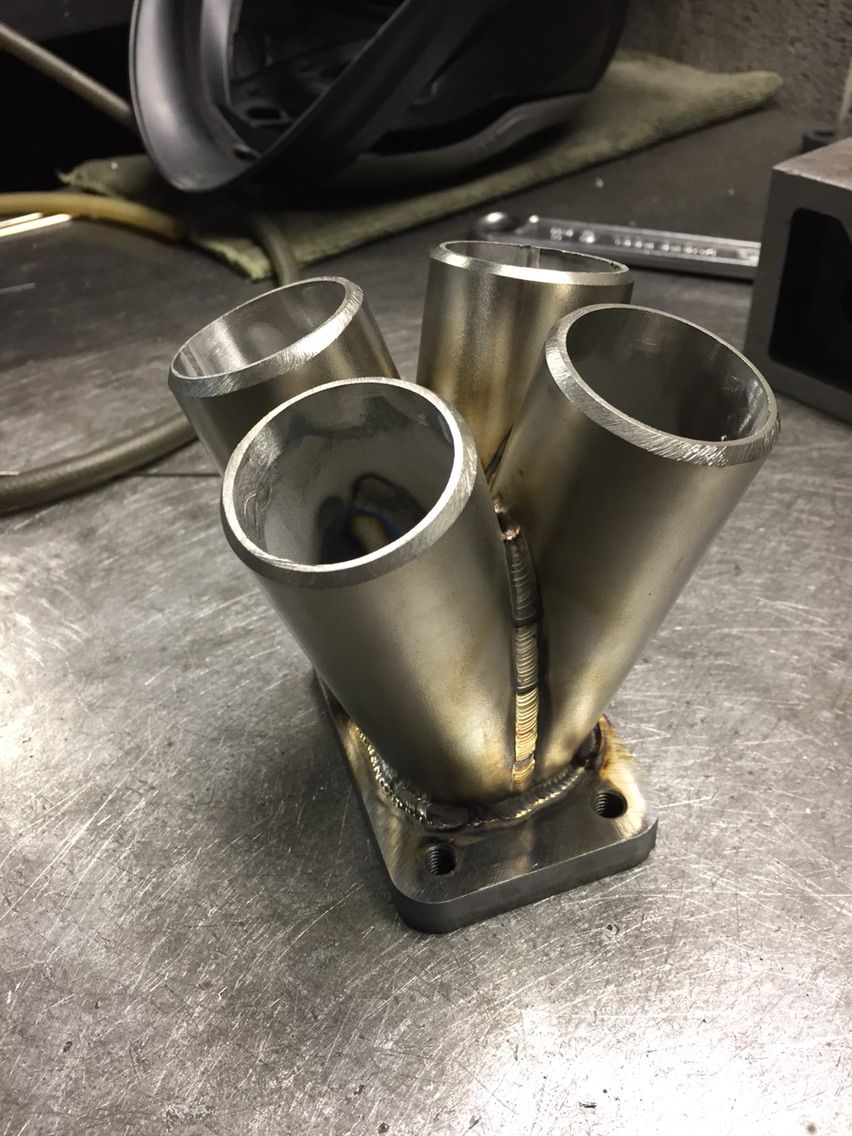 既存のキットの06用です、6-3-2-1の作りでターボフランジには横から集合するタイプはコンパクトにでき、剛性の無いパイプなら擦り合わせて作れるので主流の方法です。これはもう日本古来よりの伝統の作りとも言えます。しかしそれも問題点は多く抱え、その他の選択も無く、自身で納得出来る物を作るのは非常に困難で、諦めやこういう物だと思う事や鋳物マニに逃げ、ロストワックスは割れない伝説も一時でましたが、高速コースで30分でヒートクラックのオンパレード。そんなマイナスの妥協点が一方的でした。ですが、高剛性で高効率の物は存在します。なので目指してみたのがベルヌーイシリーズです。材質は耐熱鋼と呼ばれる中でも安価なSUS304シリーズでスチームパイプと呼ばれるものを使い。高価な材料はありますが価格にグッと跳ね返るので回避しました。高効率を狙いたいので6-1に12°で集合する作りです。